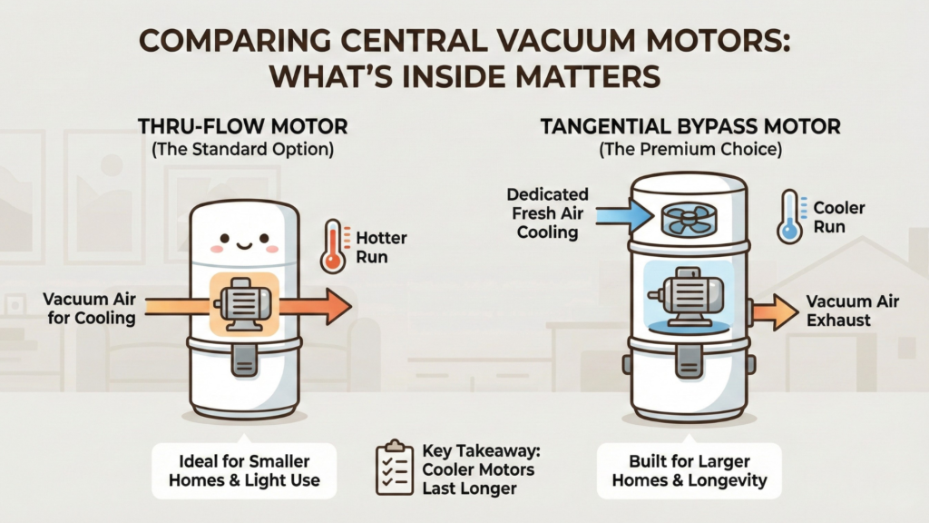 When comparing central vacuum motors at similar retail prices, always check two things: the motor type (Thru-Flow vs. Tangential Bypass) and the fan diameter. These two data points reveal the true value behind the price tag. A system with a 5.7-inch Thru-Flow motor should cost significantly less than one housing an 8.4-inch Tangential Bypass — if it doesn’t, you’re likely paying a premium for the brand name rather than the hardware.